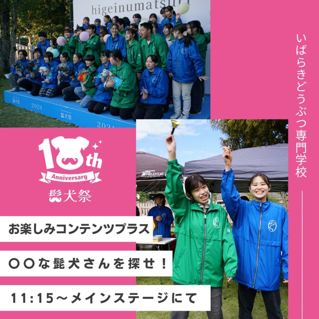 11時15分からメインステージにいばらきどうぶつ専門学校の学生さんによるコンテンツ開催! 「〇〇な髭犬さんを探せ!」 🍀お題のモノを会場内から探す参加型ゲーム!💕上位には賞品もあるよ&#x...